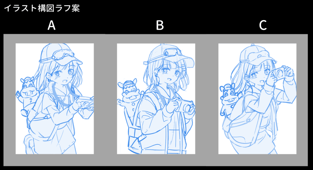 その為、ご希望を踏まえて以下の様なキャラクターのラフ案や構図のラフ案をご提案させていただきました。